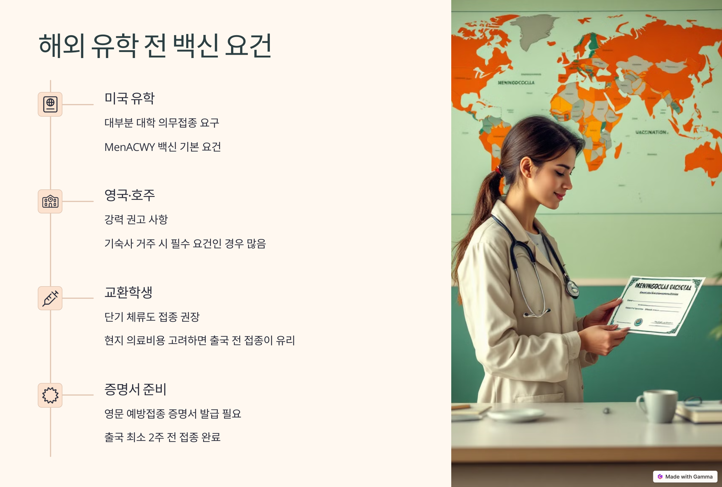 유학 전에는 반드시 입학 예정 학교의 백신 제출 요건을 확인하고, 국문·영문 접종증명서를 미리 발급받는 것이 중요합니다.