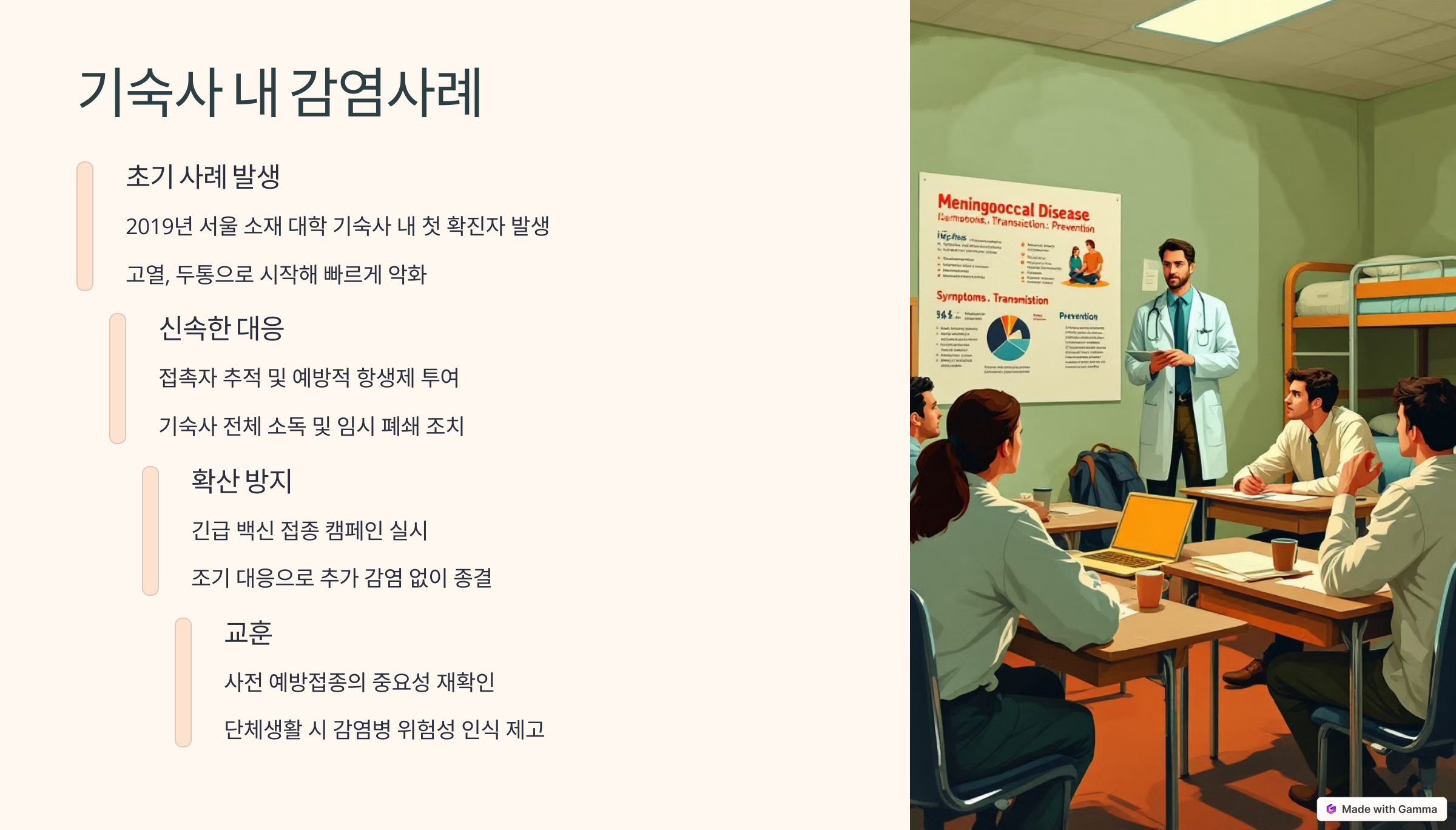 - 사례 1 – 국내 대학교: 기숙사 입소 3주 후 고열·구토 증상 → 수막염 진단 후 중환자실 입원