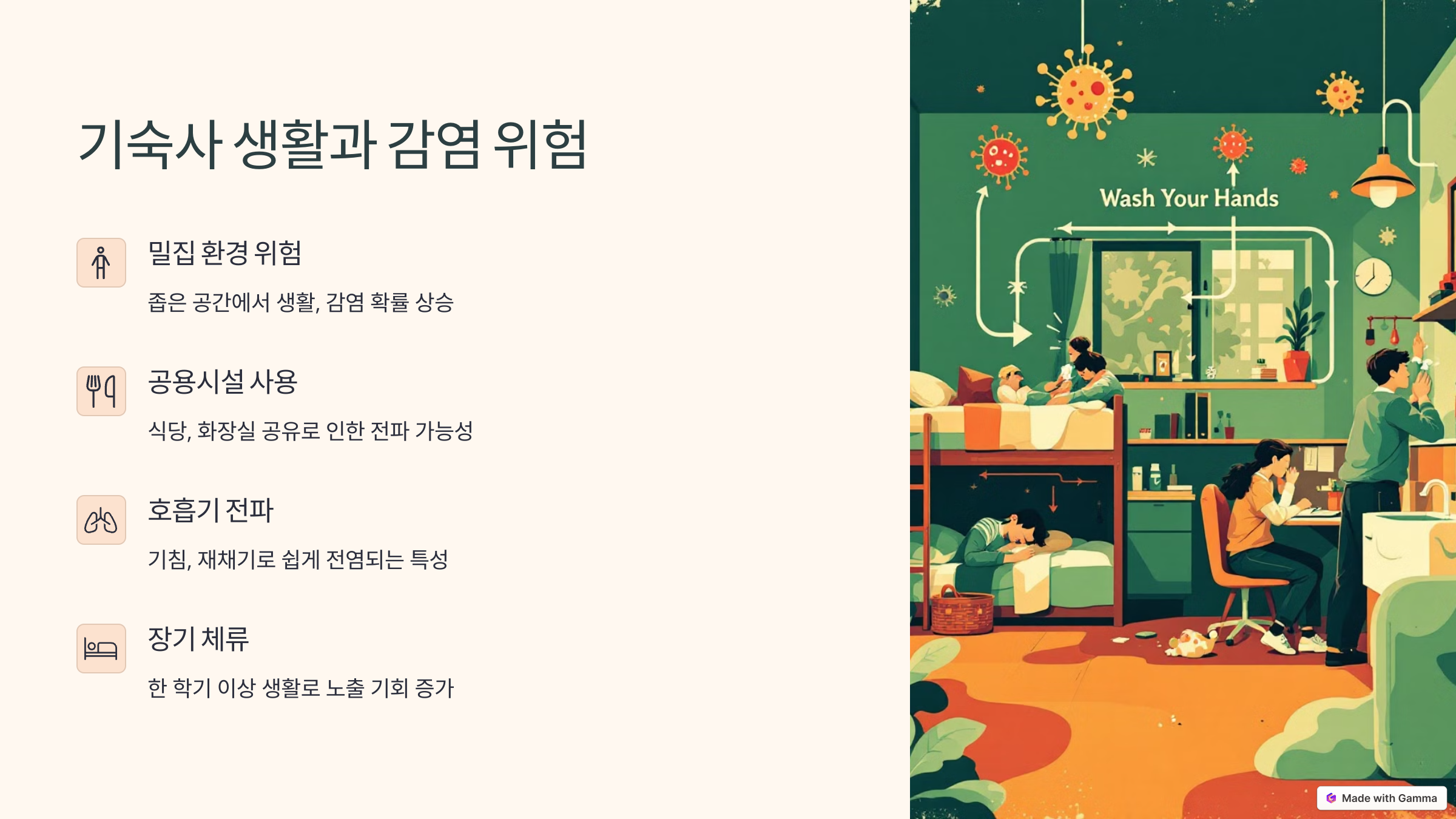 - 밀폐 공간 생활: 방 공유, 공동 세면대, 공용 식당 등 전염 위험 증가