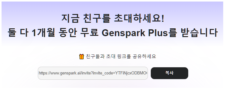 친구 초대: 무료가입 시 초대한 친구와 본인 모두 1개월 Genspark Plus를 무료 이용 자격부여